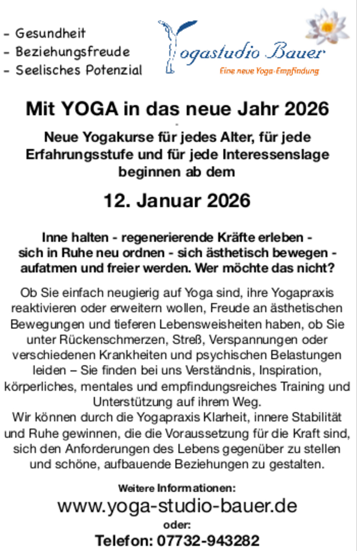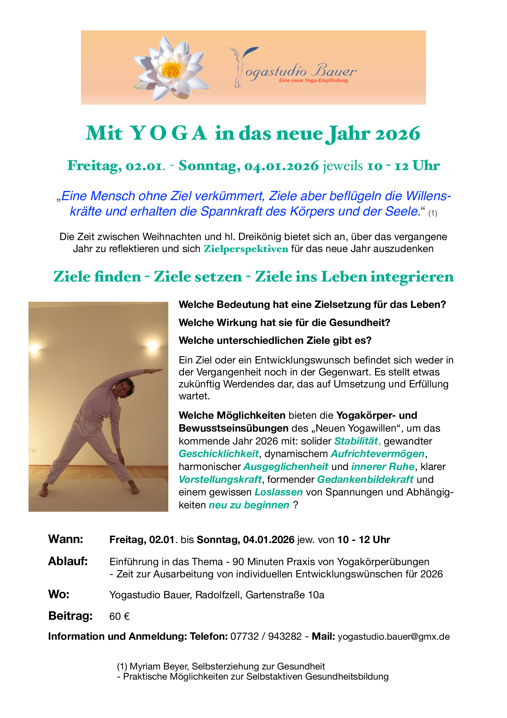 Unser Anliegen als Yogalehrer ist es, dass Sie als Klient Fortschritte in ihrer körperlichen, psychischen und seelisch-geistigen Entwicklung erleben können, dass Sie im Sinne einer künstlerisch-ästhetischen Selbstaktivität sich gesundheitlich regenerieren, psychisch stabilisieren, und, was eine mögliche, gut fundierte seelische und geistige Entwicklung anbelangt, sich ausreichend informieren und orientieren können. Egal ob Sie gesund sind und ein freudiges Interesse am Thema Yoga haben, oder ob Sie mit körperlichen oder psychischen Belastungen, von denen Sie freier werden wollen, zu uns kommen.